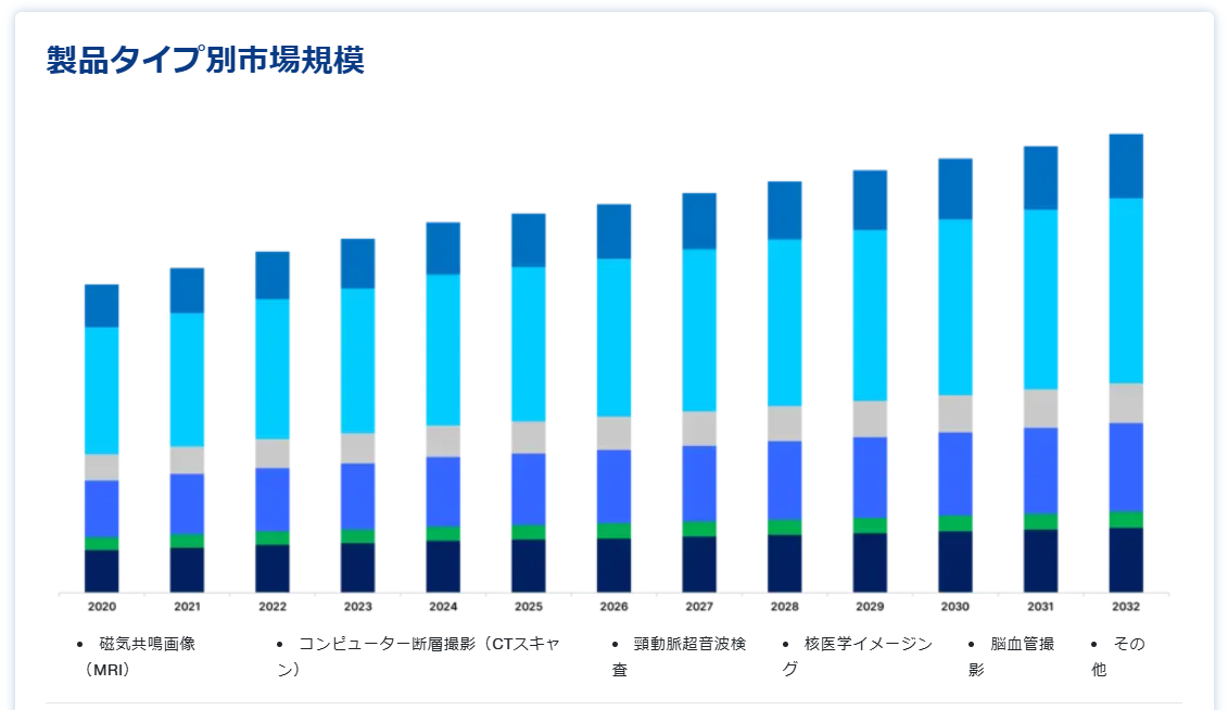 北米は、確立された医療インフラ、最新の診断機器への多額の投資、脳卒中の有病率の高さなど、複合的な要因によって世界市場を支配している。 GEヘルスケア、シーメンスヘルスケア、富士フイルム、キヤノンメディカルシステムズ、アルピニオンメディカルシステムズ、アナロジックコーポレーション、IMRIS Inc.などの大手業界企業の存在が、この地域の市場成長をさらに後押ししている。 これらの企業の継続的な技術革新と製品の進歩が、北米の主導的地位を強化している。