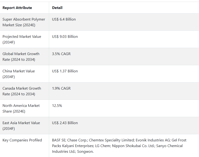 世界の高吸水性ポリマー市場の展望(2024~2034)~種類別、グレード別、用途別、地域別分析