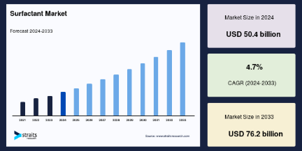界面活性剤市場の規模は、2024年に504億米ドルと評価され、2025年には528億米ドル、2033年には762億米ドルに達すると推定されており、予測期間(2025年~2033年)中に年平均成長率(CAGR)は4.7%となる見込みです。界面活性剤は、表面活性剤とも呼ばれ、化学産業において最も広く、かつ多用途な成分です。これらは、液体同士や固体と液体の間の表面張力を減少させ、物質の広がりや接触特性を向上させます。界面活性剤は、溶解できない染料や香料の水性懸濁液を分散させるために使用されます。表面活性分子は、部分的に脂溶性(脂質や油に溶解する)であり、部分的に親水性(水に溶解する)である必要があります。エマルジョン剤や発泡剤として、界面活性剤は水と油または脂質の間の界面に集まります。