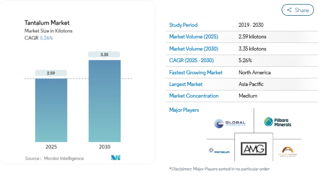 タンタル市場規模は、2025年には2.59キロトンに達し、CAGR 5.26%で成長し、2030年には3.35キロトンに達すると予測されています。