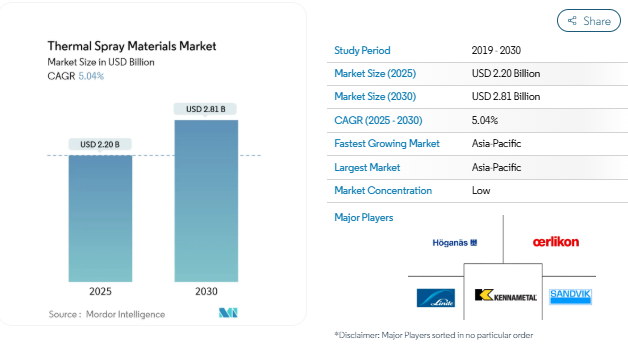 2025年には、溶射材料の市場規模は22億米ドルに達する見込みです。