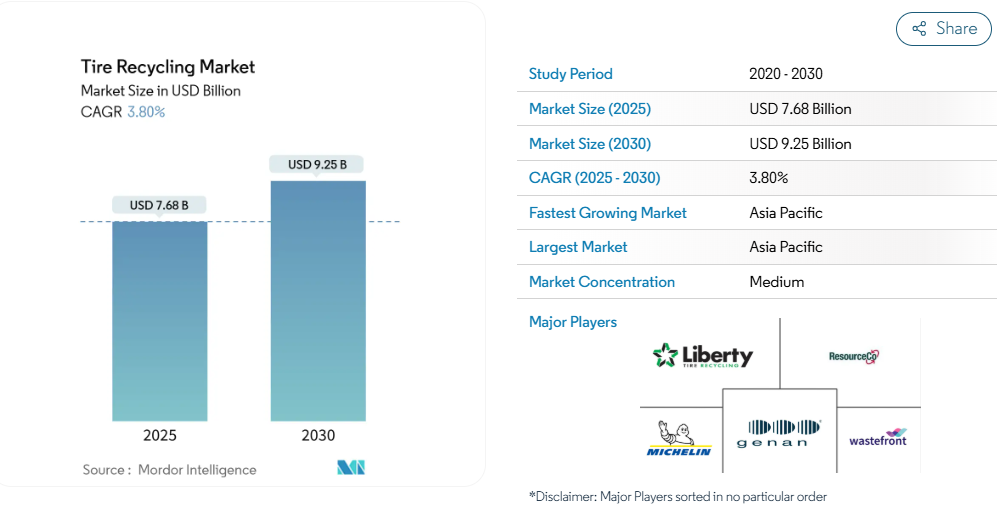 タイヤリサイクル市場の規模は、2025年に76億8,000万米ドルと推定されており、予測期間(2025年~2030年)において年平均成長率(CAGR)3.80%で成長し、2030年までに92億5,000万米ドルに達すると見込まれております。