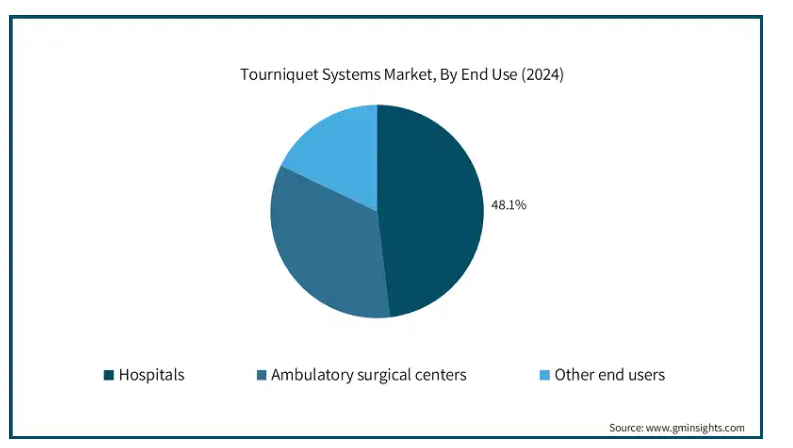 止血帯システム市場は、エンドユーザー別に病院、外来手術センター、その他のエンドユーザーに分類されます。2024年の売上高シェアは48.1%で、病院セグメントが市場を独占。