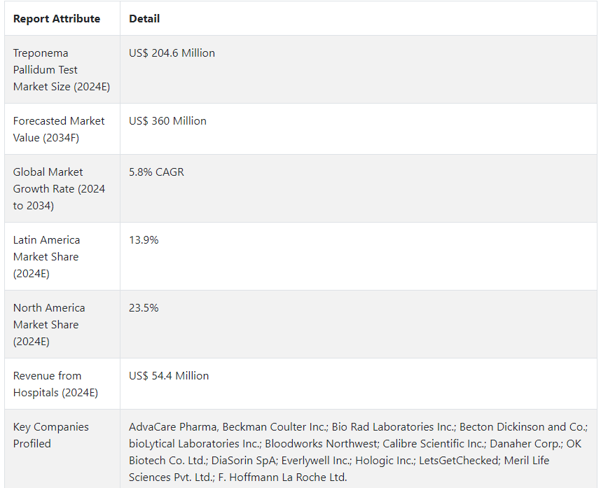 トレポネーマ・パリダム検査の世界市場:2024年-2034年~市場シェア分析、成長予測