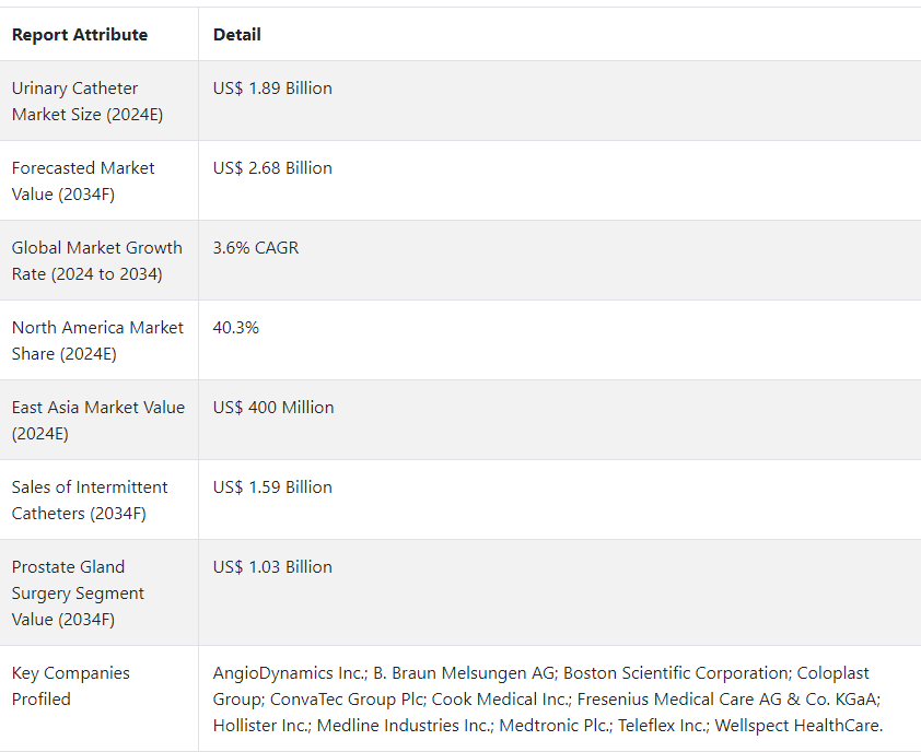 尿道カテーテルの世界需要は、2024年から2034年にかけてCAGR 3.6%で増加すると予測される。