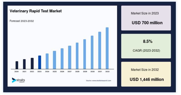 さらに、動物用迅速検査は、ポリメラーゼ連鎖反応(PCR)のような分子診断ツールとの統合が進んでいる。 これらの方法は、核酸の同定において高い感度と特異性を提供し、特定の疾患の正確な同定を可能にする。 オーストラリアのラ・トローブ大学は2022年10月、わずか1時間以内に肝インフルエンザを検出できる、新しい迅速等温PCR検査の開発に成功した。 この検査は、ウシ、ヒツジ、その他の咀嚼動物に影響を与える致死的な寄生虫の感染を軽減することを目的としている。