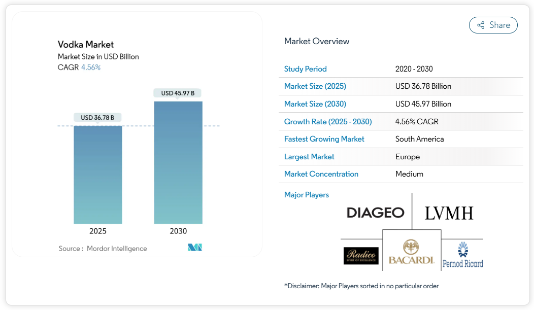 ウォッカ市場の規模は2025年に367億8,000万米ドルと推定され、2030年までに459億7,000万米ドルに達すると予測されており、年平均成長率(CAGR)は4.56%を記録する見込みです。健康志向による節度ある飲酒が勢いを増し続ける中、市場の成長は主にプレミアム戦略、革新的なフレーバー展開、およびオントレード販売の回復によって牽引されています。
