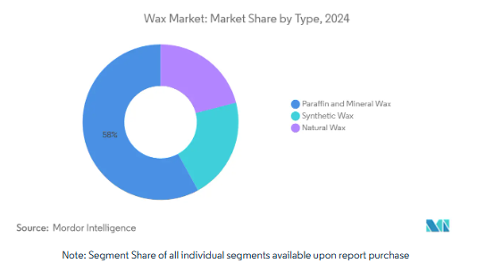- 種類別では、パラフィンとミネラルグレードが2024年のワックス市場シェアの58%を占めトップ、天然ワックスは2030年まで年平均成長率3.43%で拡大すると予測。