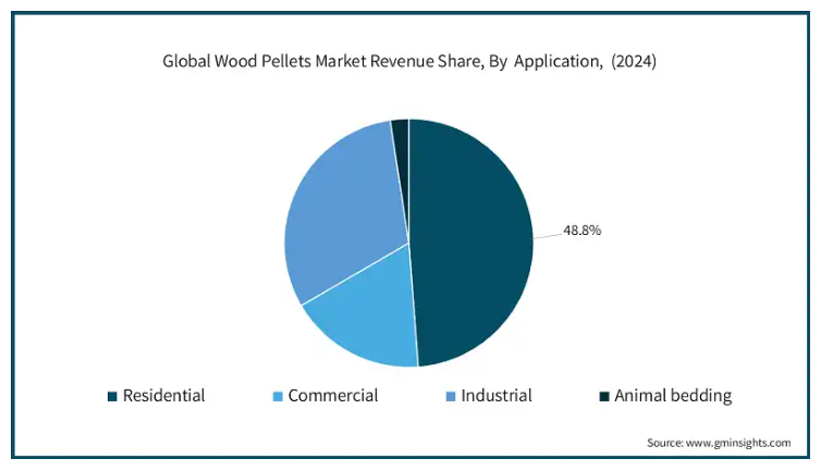 木質ペレット市場は、グレード別にプレミアム、ユーティリティ、スタンダードに分類されます。ユーティリティセグメントは、様々な電子機器用途でのユーティリティ木質ペレットの使用増加により、2034年まで年平均成長率18%以上で成長すると予測されています。この製品は、欧州とアジア太平洋地域の主要な産業部門で人気を集めているため、今後10年間で大きな牽引力を得る可能性があります。しかしその反面、ユーティリティグレードの木質ペレットには6%以上の灰分が含まれているため、家庭用暖房分野での使用は制限されています。