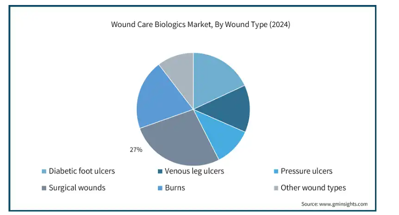 医療提供者による成長因子、皮膚代替物、細胞外マトリックスベースの製品などの再生創傷ケア生物製剤の需要の増加が市場発展を加速しています。これらの製品は、糖尿病性足潰瘍や褥瘡などの慢性創傷の治癒を促進します。