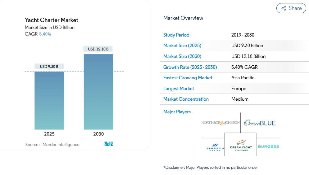 ヨットチャーター市場の規模は2025年に93億米ドルであり、2030年までに121億米ドルに達すると予測されています。これは着実な5.40%の年平均成長率(CAGR)を反映しています。アジアおよび中東における富裕層の増加、地中海地域の規制緩和、デジタル予約ツールの普及が参入障壁を下げ、成長を支えています。