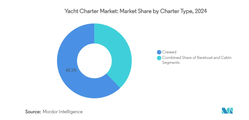 クルー付きチャーターは、新規参入者や時間的制約のある旅行者に訴求する完全スタッフ付きサービスにより、2024年のヨットチャーター市場シェアの62.14%を占めました。このクラスの船舶では、ゲストペアごとに1名の乗組員を割り当てるケースが多く、個別対応による付加価値を提供しています。収益面では控えめながら、キャビンチャーターは年平均成長率9.82%で急速に拡大しており、船舶単位ではなくキャビン単位で料金を支払う中所得層へ市場を拡大しています。東南アジアでは現在、予約の5件に1件がキャビンチャーターであり、市場拡大におけるその役割が浮き彫りとなっています。