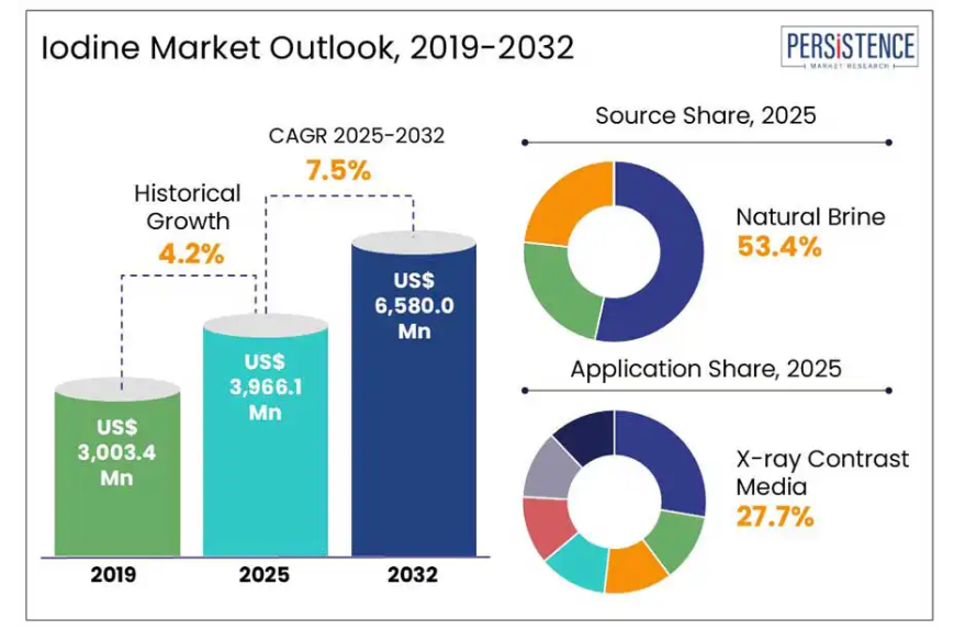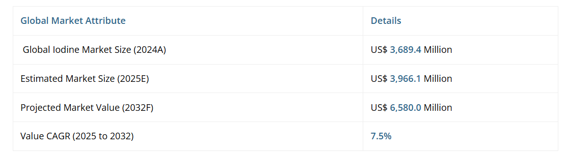 パーシステンス・マーケット・リサーチ社によりますと、世界のヨウ素市場は大幅な拡大が見込まれており、その規模は2025年の39億6,610万米ドルから2032年までに65億8,000万米ドルへ成長し、予測期間中の堅調な年平均成長率(CAGR)7.5%を反映する見込みです。