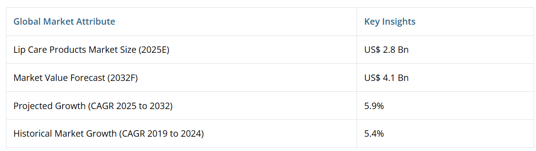 世界のリップケア製品市場規模は、2025年の28億ドルから2032年までに41億ドルへ拡大すると予測されております。2025年から2032年にかけて年平均成長率(CAGR)5.9%で成長すると見込まれております。