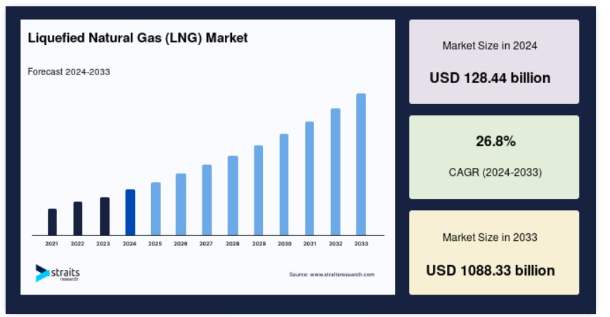 世界のLNG市場規模は2024年に1284.44億米ドルと評価され、2025年の1628.6億米ドルから2033年には1兆833億米ドルに達すると予測されています。予測期間(2025~2033年)のCAGRは26.8%の成長率です。