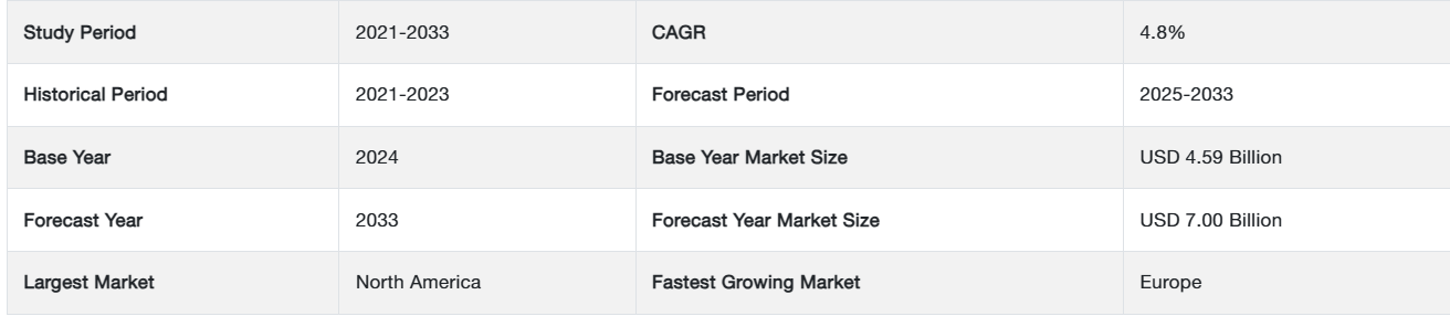 市場規模は2024年には45億9000万米ドルと評価されました。2025年には48億1000万米ドル、2033年には70億米ドルに達すると予測されており、予測期間(2025年~2033年)中のCAGRは4.8%で成長すると見込まれています。