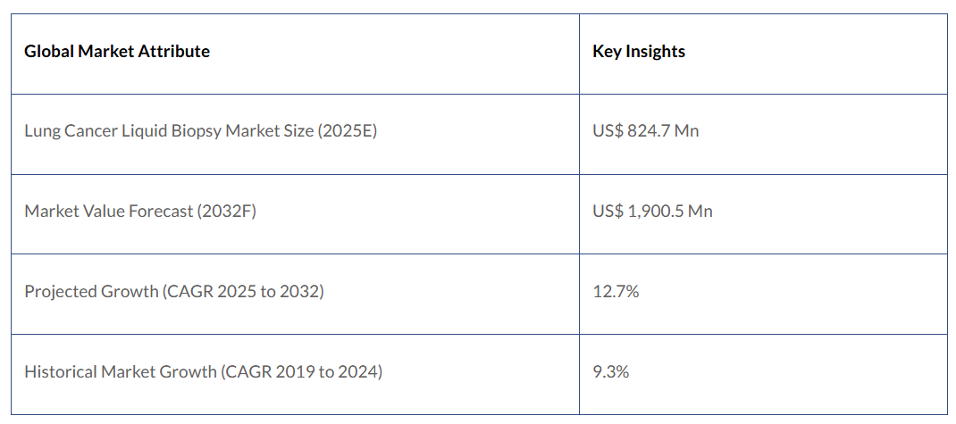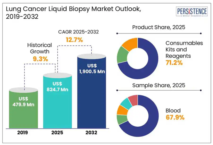 パーシステンス・マーケット・リサーチが発表した最新の報告書によりますと、世界の肺がん液体生検市場規模は、2025年の8億2470万ドルから2032年までに19億500万ドルに達し、年平均成長率(CAGR)12.7%で成長すると予測されております。