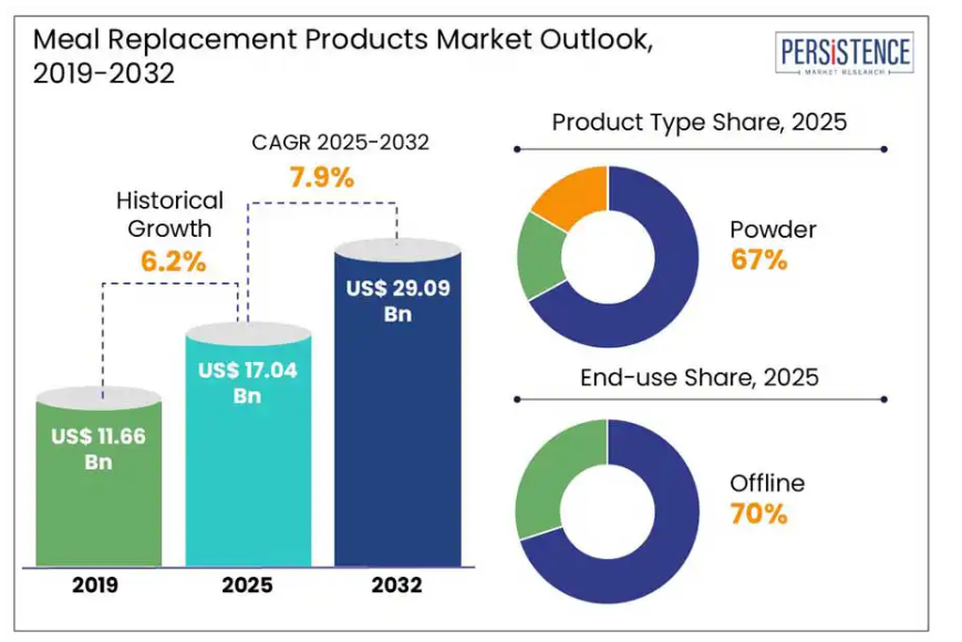 レディ・トゥ・ドリンク(RTD)セグメントは、その利便性と即時使用可能性から、2025年から2032年にかけて最も急速な成長が見込まれています。RTD製品は汎用性が高く、外出先での摂取、旅行、術前栄養補給、減量に最適です。優れた味と満腹感を提供し、高カロリーな食事を栄養バランスの取れた代替品として効果的に置き換えます。植物性原料の採用や、ビーガン対応、乳糖不使用、ケトジェニック対応など特殊な配合技術による革新が、その魅力を拡大しています。健康意識の高まり、多忙なライフスタイル、製品改良を背景に、RTD市場は2032年までにほぼ倍増すると予測されています。