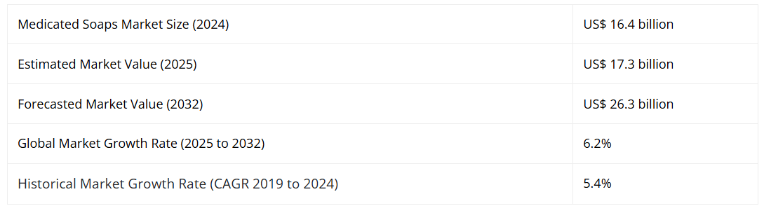 世界の薬用石鹸市場は、2024年末時点で164億ドルと評価され、6.2%の年平均成長率(CAGR)で拡大し、2032年末までに263億ドルの市場規模に達すると予測されております。