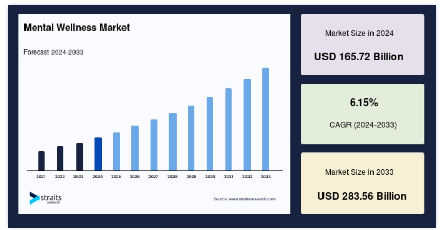 世界のメンタルウェルネス市場規模は、2022年に1,657億2,000万米ドルと評価され、2025年に1,759億1,000万米ドルから2033年には2,835億6,000万米ドルに達し、予測期間(2025年~2033年)において年平均成長率(CAGR)6.15%で成長すると予測されています。