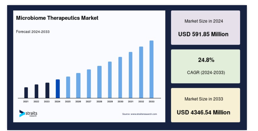 世界のマイクロバイオーム治療薬市場規模は、2024年に5億9,185万米ドルと評価され、2025年に7億3,863万米ドルから2033年までに43億4,654万米ドルへと成長し、予測期間(2025年~2033年)において年平均成長率(CAGR)24.8%で成長すると予想されています。
