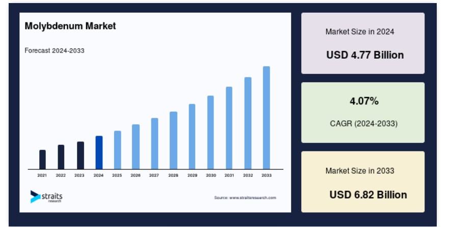 モリブデン市場の規模は2024年に47億7,000万米ドルと評価され、2025年には49億6,000万米ドル、2033年には68億2,000万米ドルに達し、予測期間(2025年~2033年)において年平均成長率4.07%で成長すると予測されています。