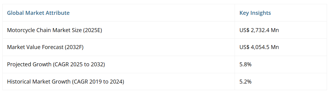世界のオートバイ用チェーン市場規模は、2025年の27億3,240万ドルから2032年までに40億5,450万ドルへ拡大すると予測されています。2025年から2032年にかけて年平均成長率(CAGR)5.8%で成長すると見込まれています。
