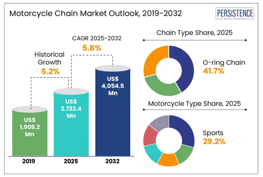 Persistence Market Researchの報告書によりますと、通勤者、バイク愛好家、スポーツ愛好家の間でオートバイの人気が高まっていることが、オートバイ用チェーンの需要を後押ししております。シール付きOリングチェーンやXリングチェーンといった技術革新により、耐久性が向上しメンテナンスが軽減されることで性能が大幅に向上し、消費者が高性能チェーン製品を好むよう促しております。