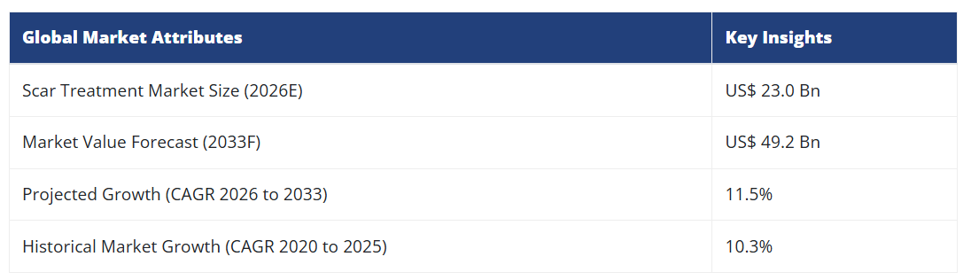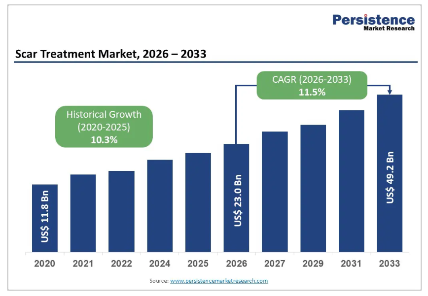世界の瘢痕治療市場は、2026年の230億ドルから2033年までに492億ドルへ成長すると予測されております。2026年から2033年にかけて、年平均成長率(CAGR)11.5%で拡大が見込まれております。