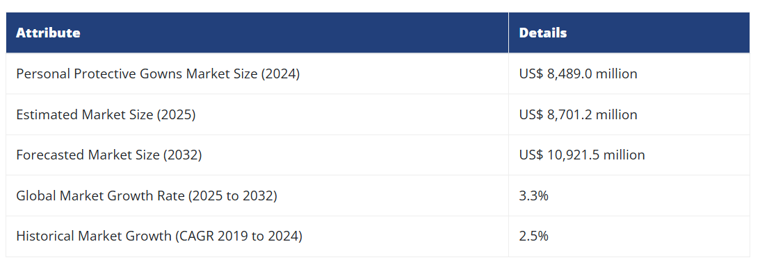 個人用防護ガウンの世界市場は、予測期間(2025年から2032年)において3.3%のCAGRで成長すると見込まれています。