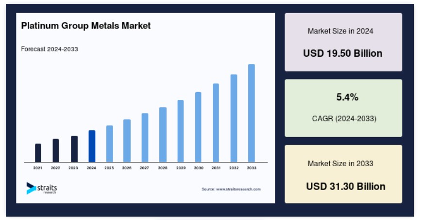 世界のプラチナ族金属市場は、2024年に195億米ドルと評価され、2025年に205億5000万米ドルから2033年には313億米ドルに達し、予測期間(2025年~2033年)において年平均成長率5.4%で成長すると予測されています。