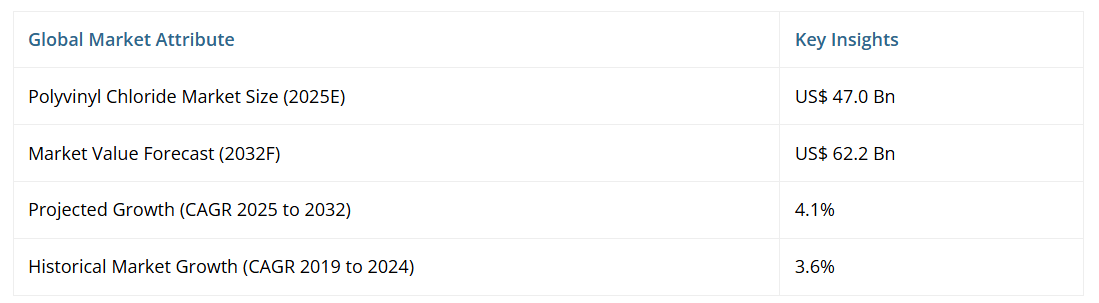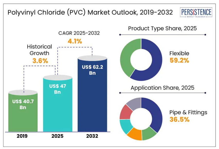 世界のポリ塩化ビニル(PVC)市場は、2025年の470億ドルから2032年までに622億ドルへ成長し、2032年までに年平均成長率(CAGR)4.1%を達成すると予測されています。