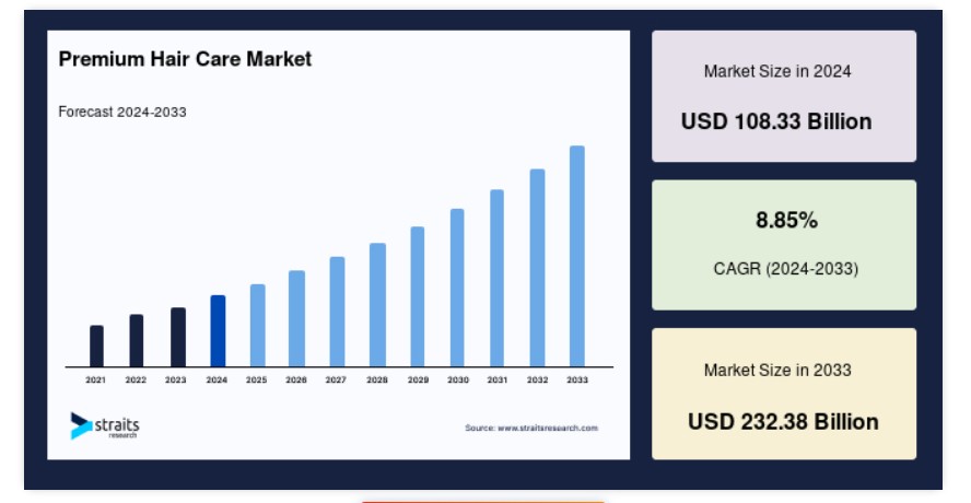世界のプレミアムヘアケア市場規模は、2024年にUSD 108.33億ドルと評価され、2025年にはUSD 117.91億ドル、2033年にはUSD 232.38億ドルに達すると予測されており、予測期間(2025年~2033年)において8.85%の年平均成長率(CAGR)で成長すると見込まれています。