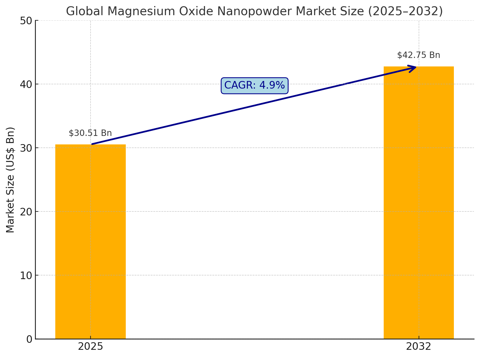 The global magnesium oxide (MgO) nanopowder market is projected to grow from USD 30.51 billion in 2025 to USD 42.75 billion by 2032, reflecting a compound annual growth rate (CAGR) of 4.9%. This upward trend is driven by the material’s diverse applications across high-growth industries such as electronics, ceramics, energy, and environmental remediation.