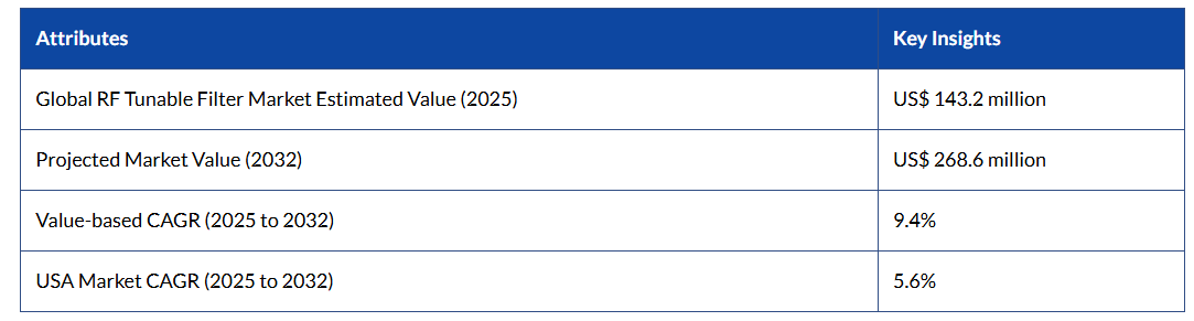 Persistence Market Researchによると、米国のRF可変フィルタ市場は、2025年から2032年の間に5.6%という着実な年平均成長率(CAGR)で拡大する見込みです。2019年から2024年の間、米国におけるRF可変フィルタの需要は7.9%のCAGRを記録しました。