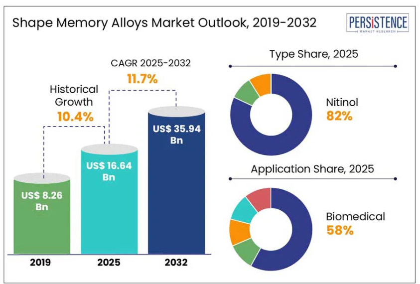 Persistence Market Researchの報告書によると、この成長は、形状記憶合金が超弾性、軽量、コンパクト、エネルギー効率に優れていることから、電子、バイオメディカル、自動車産業における需要の高まりによって牽引されています。