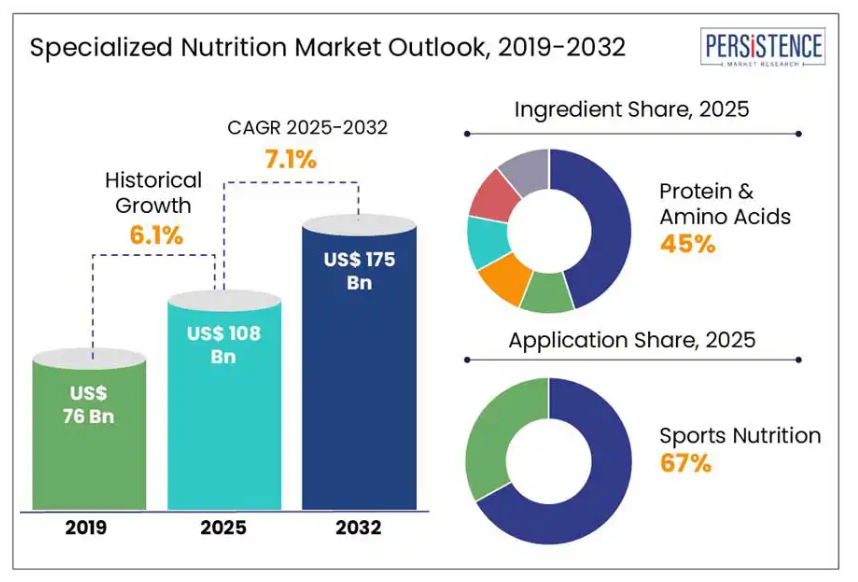 世界の専門栄養市場規模は大幅に拡大が見込まれており、2025年には市場価値が1080億ドルに達し、2032年までに年平均成長率(CAGR)7.1%で推移し、約1750億ドルの市場規模に達すると予測されています。