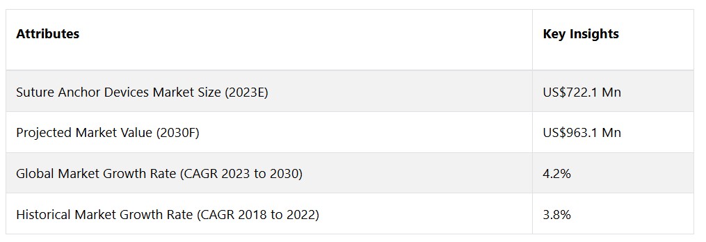 グローバルな縫合アンカー装置市場は、4.2%のCAGRで拡大し、2023年の7億2,210万米ドルから、2030年末には9億6,310万米ドルに増加すると予測されています。