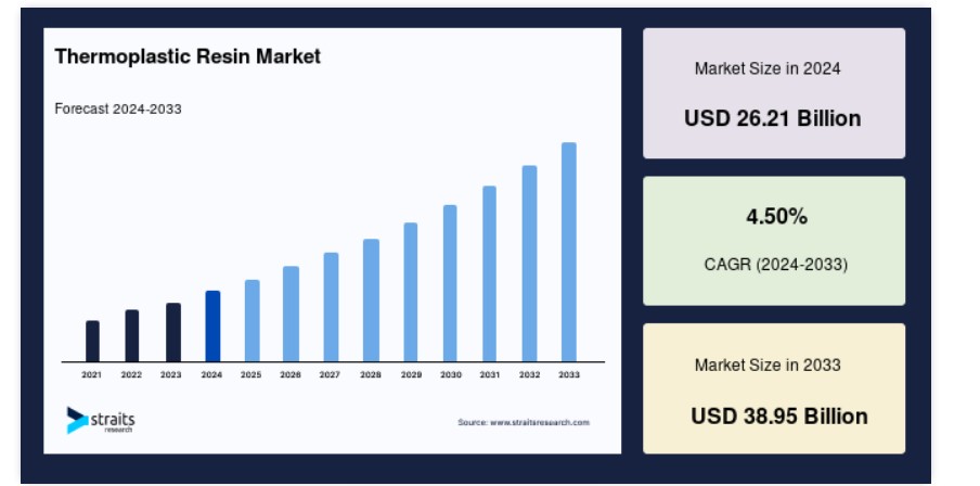 世界の熱可塑性樹脂市場は、2024年に262億1,000万米ドルと評価され、2025年に273億9,000万米ドルから2033年に389億5,000万米ドルに達し、予測期間(2025年~2033年)において年平均成長率(CAGR)4.50%で成長すると予測されています。