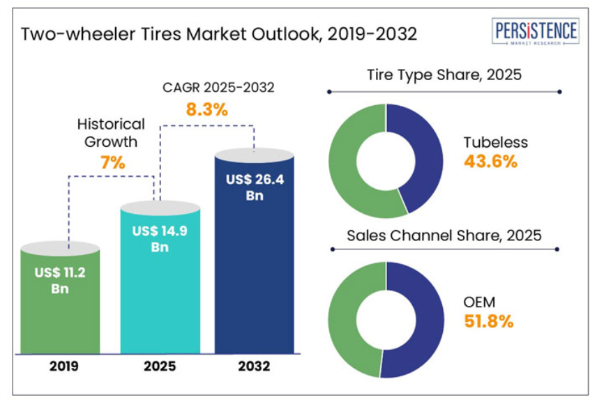 世界の二輪車用タイヤ市場規模は、2025年に149億ドルに達すると推定されております。2025年から2032年までの予測期間において、年平均成長率(CAGR)8.3%で増加すると予測されております。2032年までに264億ドルの価値に達する見込みでございます。