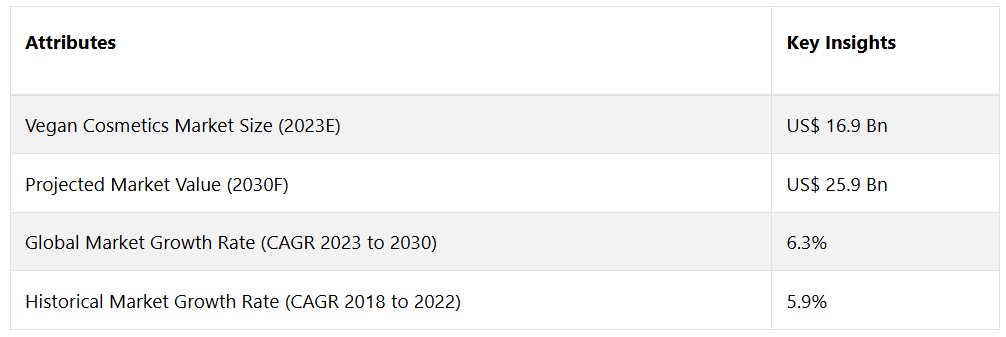 世界的なヴィーガン化粧品市場は、年平均成長率(CAGR)6.3%で拡大し、2023年の169億米ドルから2030年末までに259億米ドルに増加すると予測されています。