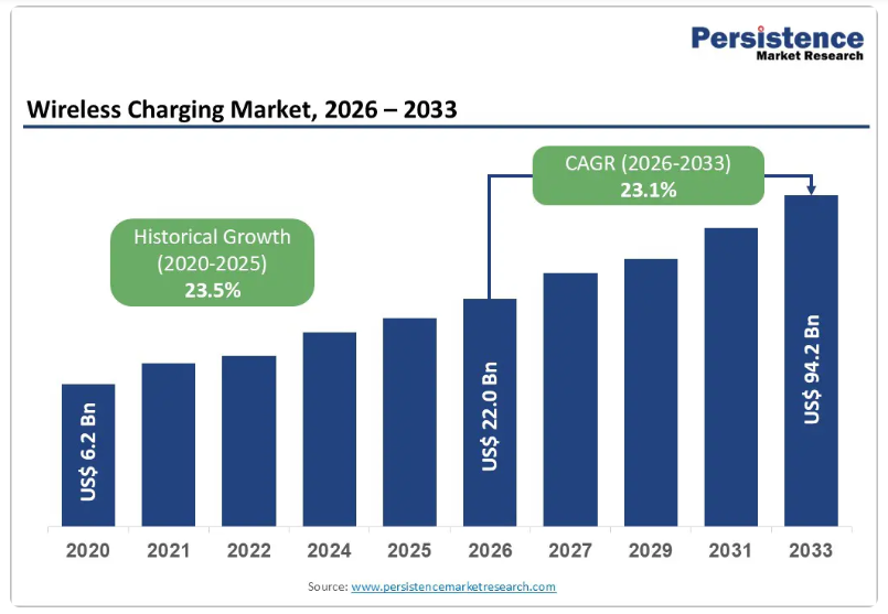 - ヨーロッパワイヤレス充電市場の展望:過去実績(2020年~2025年)および予測(2026年~2033年)