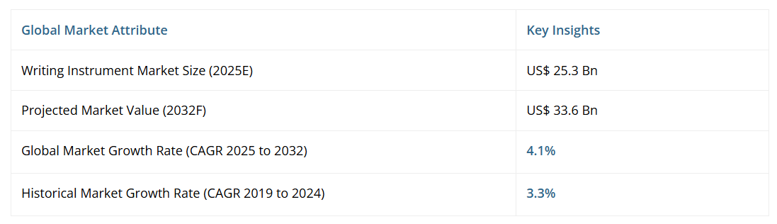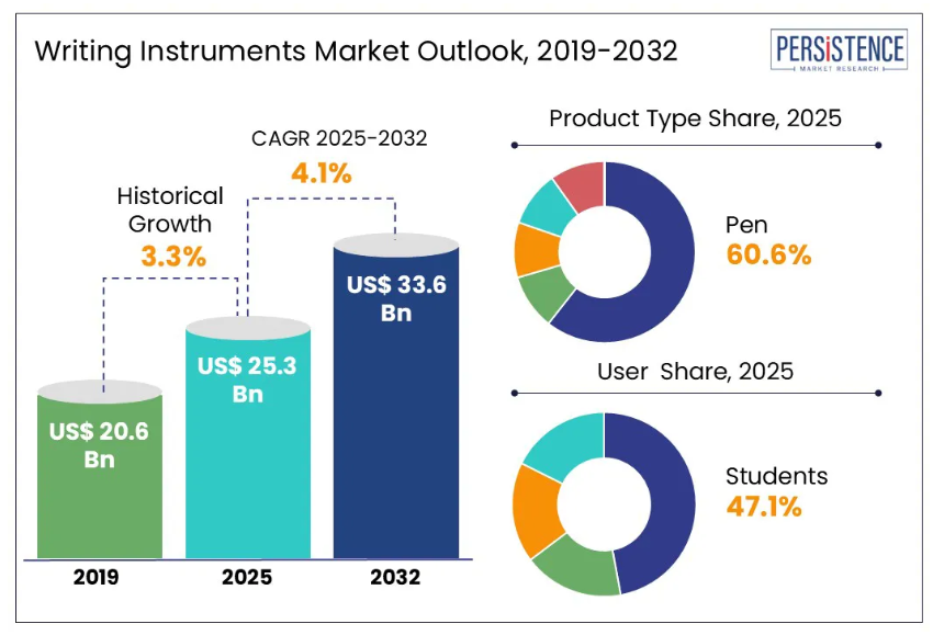 世界の筆記具市場の規模は、2025年には253億ドルと評価される見込みであり、2032年までに336億ドルに達すると予測されています。予測期間である2025年から2032年にかけて、年平均成長率(CAGR)4.1%で成長すると見込まれます。